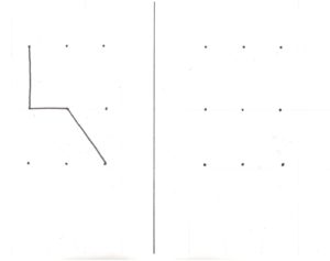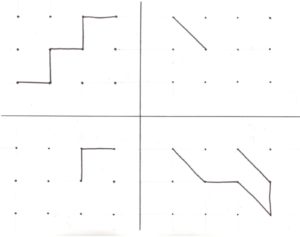 Z naszych doświadczeń wynika, że prościej odwzorowuje się linie proste i pod kątek prostym, natomiast trudniejszym zadaniem są skosy. Zadanie można dowolnie utrudniać, zwiększając liczbę kropek i stopień skomplikowania obrazka. Generalnie, na początek, warto pokazać dziecku punkt startu: np. narysować jedną z linii, by odnalazło się w przestrzeni.