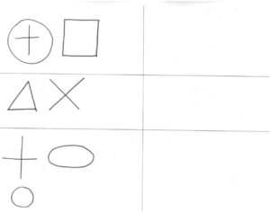 Prosimy, aby dziecko powtórzyło za nami rysunek według wzoru. Cel zadania polega na tym, by właściwie rozmieścić figury względem siebie. Czyli, np. krzyżyk jest w kółku, kwadrat jest na prawo od koła. Trudno oczekiwać, by rysunki – wzór i to narysowane przez dziecko były identyczne.