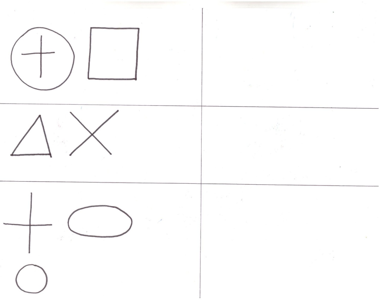 Prosimy, aby dziecko powtórzyło za nami rysunek według wzoru. Cel zadania polega na tym, by właściwie rozmieścić figury względem siebie. Czyli, np. krzyżyk jest w kółku, kwadrat jest na prawo od koła. Trudno oczekiwać, by rysunki – wzór i to narysowane przez dziecko były identyczne.